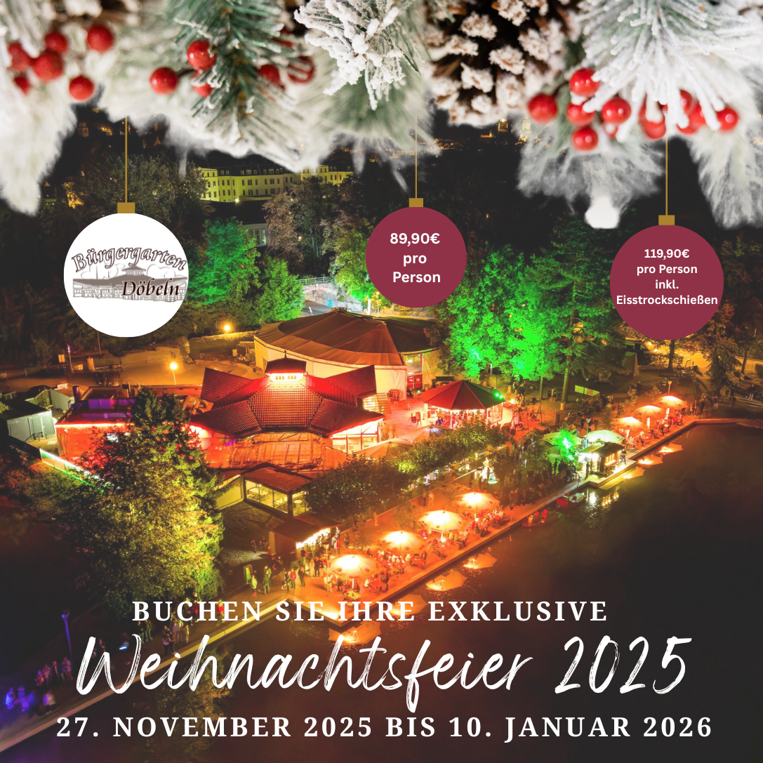 Feiern Sie Ihre exklusive Weihnachtsfeier in festlicher Atmosphäre – im Bürgergarten Döbeln! Vom 27. November 2025 bis 10. Januar 2026 erwarten Sie stimmungsvolle Musik, köstliches Buffet und winterlicher Glanz.